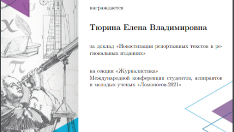 Доклад преподавателя журфака ВГУ Елены Владимировны Тюриной «Новостизация репортажных текстов в региональных изданиях» признан экспертным советом конференции «Ломоносов-2021» одним из лучших и отмечен грамотой. Это был уже 28-й Международный молодежный научный форум – ежегодная конференция студентов, аспирантов и молодых учёных на факультете журналистики МГУ.