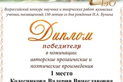 Заведующая кафедрой электронных СМИ и речевой коммуникации факультета журналистики, доцент Валерия Вячеславовна Колесникова стала победителем Всероссийского конкурса научных и творческим работ вузовских ученых, посвященного 150-летию со дня рождения первого русского лауреата Нобелевской премии по литературе И.А. Бунина. Преподаватель заняла 1 место в номинации «Авторские прозаические и поэтические произведения» с рассказом «Листопадных дел мастер».