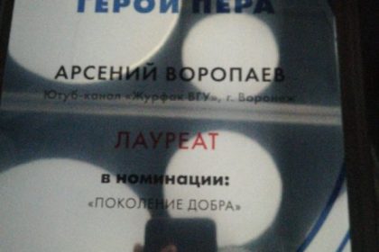 Арсений Воропаев и Виктория Чичерина стали лауреатами в номинации «Поколение добра» (СМИ, выпускаемые студентами или ВУЗами). Высокую оценку жюри (в его состав вошли известные медиаперсоны, общественные деятели, представители бизнес-компаний производственного сектора, руководители направлений по корпоративной социальной ответственности крупных промышленных холдингов) заслужила их работа «Молодёжь Today. Арина Новичихина» — большое интервью об экологии и жизни с воронежской экоактивисткой Ариной Новичихиной. Работа подготовлена в рамках дисциплины «Выпуск телепередачи» (преп. М.А. Андреева).